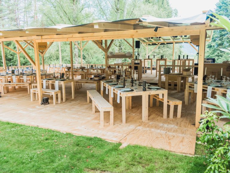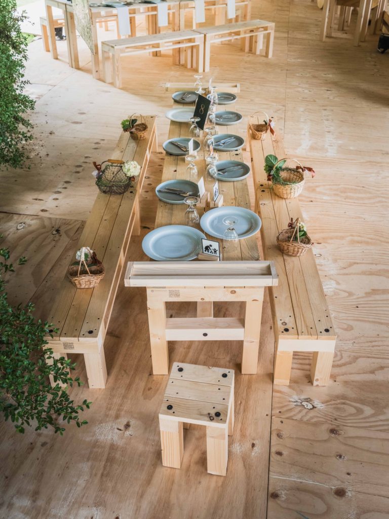 - Tische, Bänke und Hocker für